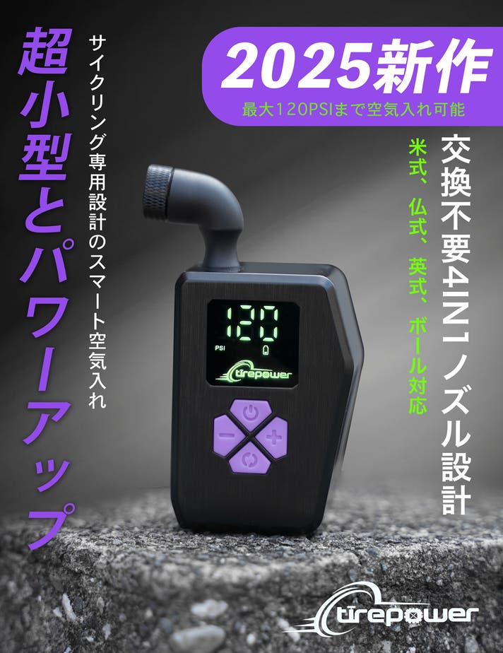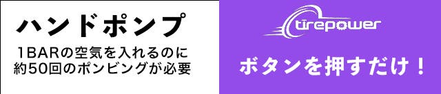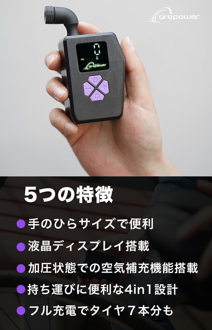 Tirepower(タイヤパワー)は、「Tire(タイヤ)」+「Power(力)」をテーマに、小型で軽量ながらも高性能な空気入れという全く新しい選択肢を提案します。