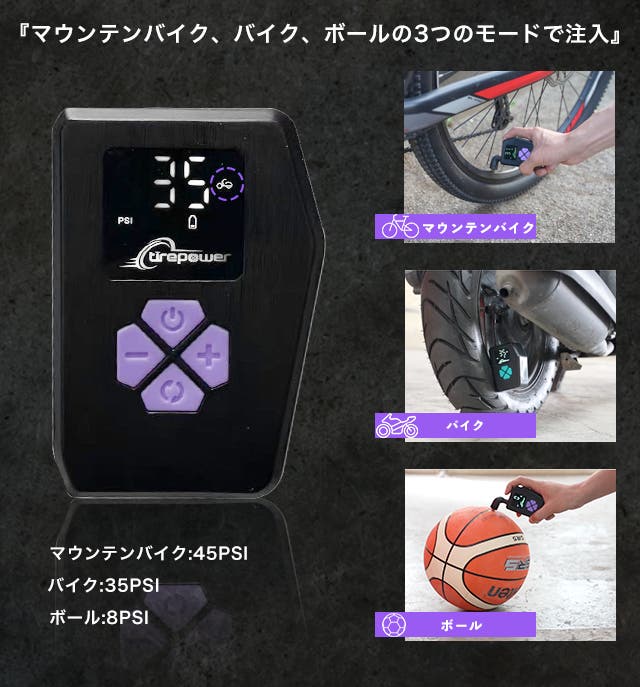 マウンテンバイクやバイク、ボールなど、空気を入れる対象に合わせてモードを選び、空気圧を設定すれば、あとはボタンを押すだけ。設定した空気圧に達すると自動で停止するため、入れすぎの心配もありません。
