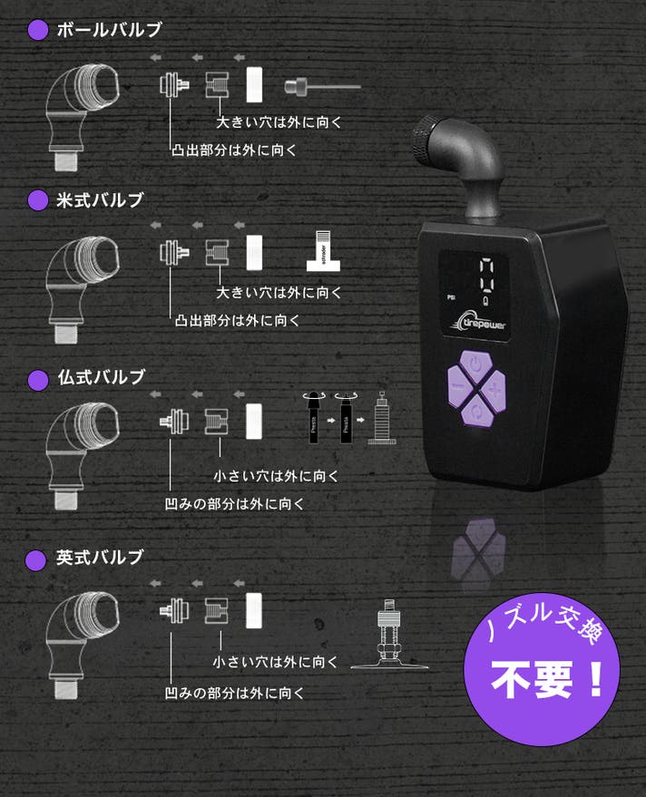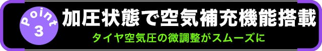 - 液晶ディスプレイで簡単に空気圧設定、ボタン一つで自動充填&ストップ!