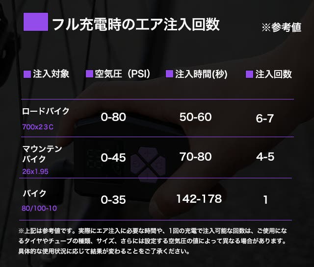 フル充電でロードバイク(700×23C・80PSI)のタイヤ最大約7本分に空気を充填可能!