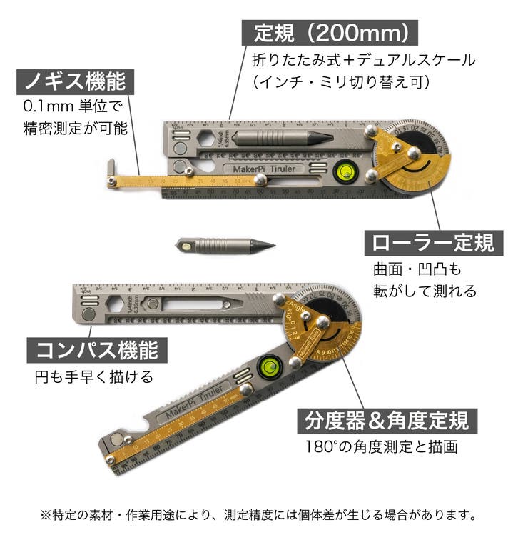 Tirulerは、折りたたみ式と展開式の両方に対応し、ヤードポンド法(インチなど)とメートル法(ミリメートルなど)という異なる測定単位に合わせた2本のアームを備えています。