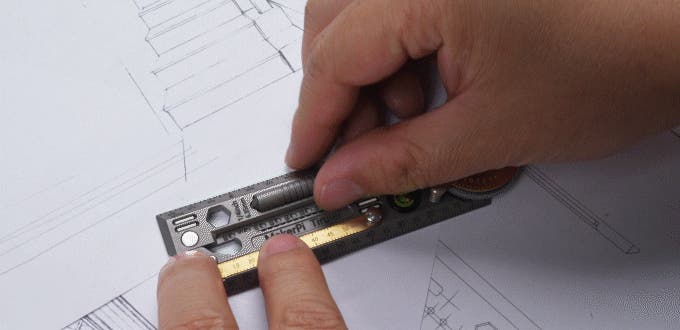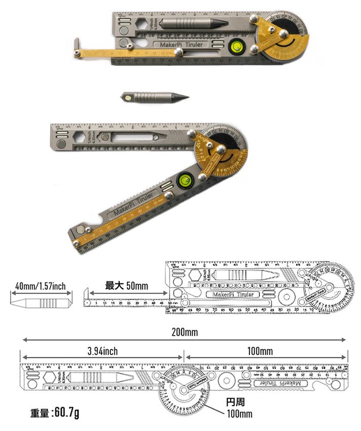- 定規、ノギス、分度器、カッターを1本に集約。折りたたみ式で200mmまで展開できる多機能設計