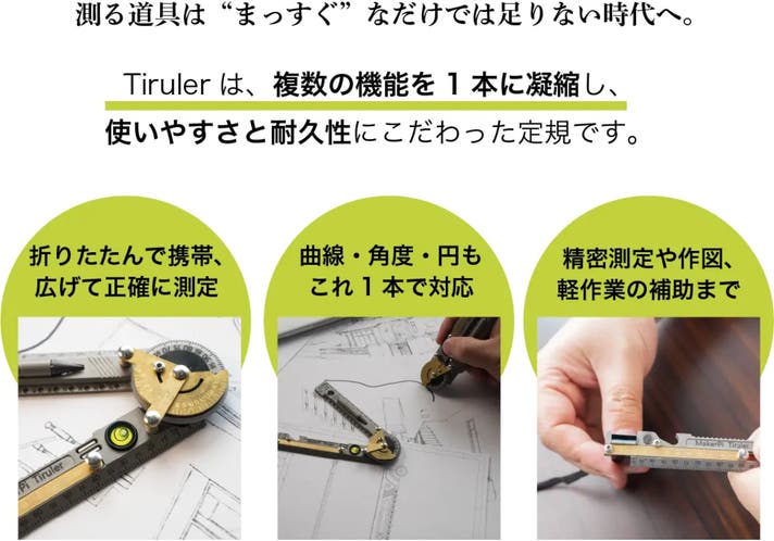 Tirulerは、1本で 「測る・描く・切る・収納」 をこなす多機能ツール定規。コンパクトで持ち運びやすく、採寸や簡単な作業をスマートにサポートします。