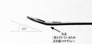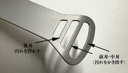 A:3枚刃のうち、各刃は機械作業に加え、さらに職人による手仕上げでの研磨加工で微細な角度を追加しております。デリケートな舌に触れる部分ですので、非常に微細な加工となっており分かりにくいかもしれませんが、熟練職人の最後のひと手間で微細に角度の違う3枚刃が相互作用をもたらし、優しく汚れを浮かして落とす設計となっております。