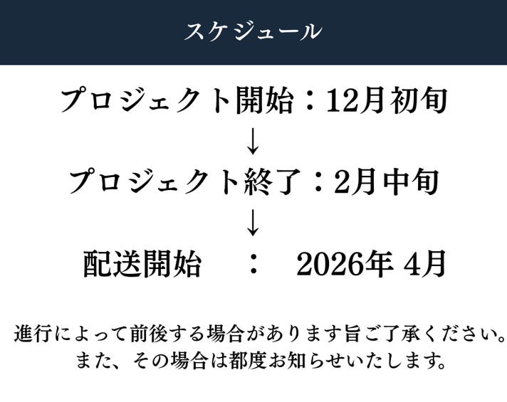 このプロジェクトはAll in型です。目標金額の達成に関わらず、プロジェクト終了日の2026年02月27日までに支払いを完了した時点で購入が成立します。