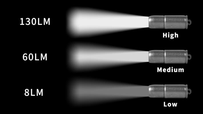 A:メインライトには3段階の明るさがあります。高130LM→中60LM→低8LM