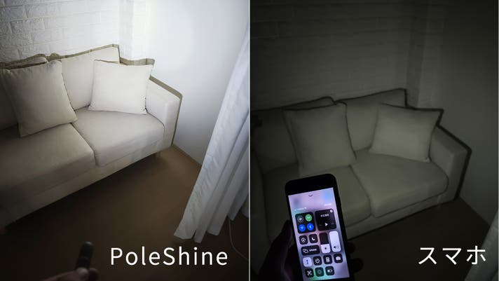 A:一般的なスマホのライトが約50ルーメン程度なのに対し、PoleShineは130ルーメン。約2.5倍以上の明るさで、足元や暗所をしっかり照らします。