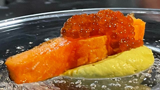 時知らずやたまには鮭児などを使ったコンフィをさっとスモークを加え、アヴォカドのムースと合わせます。ウイスキーを使って漬けるイクラを最後に合わせスモーキーな一皿。