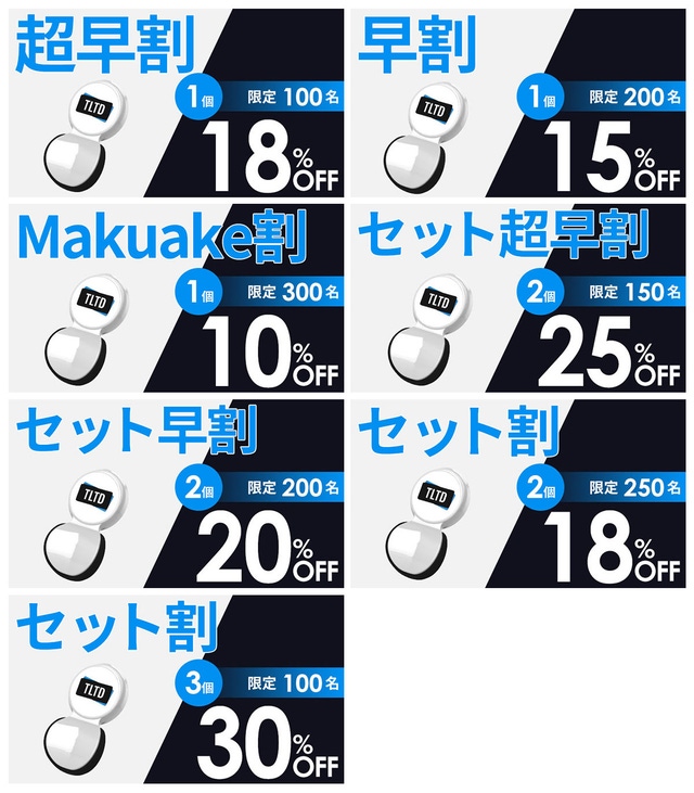 プロジェクトに関する情報 ・プロジェクトの属性:輸入商品 ・代理店によるサポート:初期不良のみ交換対応(到着から7日以内) ・実行者(国):日本 ・企画国:アメリカ ・製造国:中国 ※並行輸入品が発生する可能性があります。正規以外での個人輸入等は、完全に防ぐことができない場合がございます旨、予めご了承のほどお願いいたします。 ※リターン品の配送が完了するまで、ElderlyはTLTDの日本における独占販売権を有する正規代理店です。並行輸入品が発生する可能性がございますが、並行輸入品には正規代理店による製品サポートを受けることができません。 また、正規代理店を通じて購入することで、日本国内での流通に必要な各種認証の取得や、関税の適切な処理が担保されます。 ※一部国内に類似商品が出回っている場合がございます。弊社では他社の類似品に関してのお問い合わせには対応できませんのでご了承ください。 ※使用感などに関しては、感じ方に個人差が予想される製品でございます。そのため、使用感等に関する返品・返金はお受けいたしかねます。 ※初期不良以外に関する返品・返金はお受けいたしかねます。 ※デザイン・カラー・素材などの仕様が一部変更になる可能性がございます。 ※モニター環境によって、画像の色が実物と異なって見える場合がございます。 ※応援購入の数が想定を上回った場合、製造工程上の都合等により出荷時期が遅れる場合がございます。 ※皆様から想定を上回る応援購入を頂き、量産体制を更に充実させることができた場合、一般販売価格が予定価格を下回る可能性がございます。 ※本文中に記載させていただいたスケジュールは、あくまでプロジェクト公開時点の予定です。応援購入の性質上、配送遅延のおそれがございます。原則として、配送遅延に伴う応援購入のキャンセルはできませんが、リターン配送予定月から6ヵ月を超えた場合には、希望者に限りキャンセルにて対応させていただきます。 以上の注意点につきましてあらかじめご理解とご了承いただいた上で応援購入くださいますよう、よろしくお願い申し上げます。 最後に、本製品を手に取った皆様に喜んでもうえるよう、チームメンバー一同心を込めて対応していきますので、 応援よろしくお願い致します。
