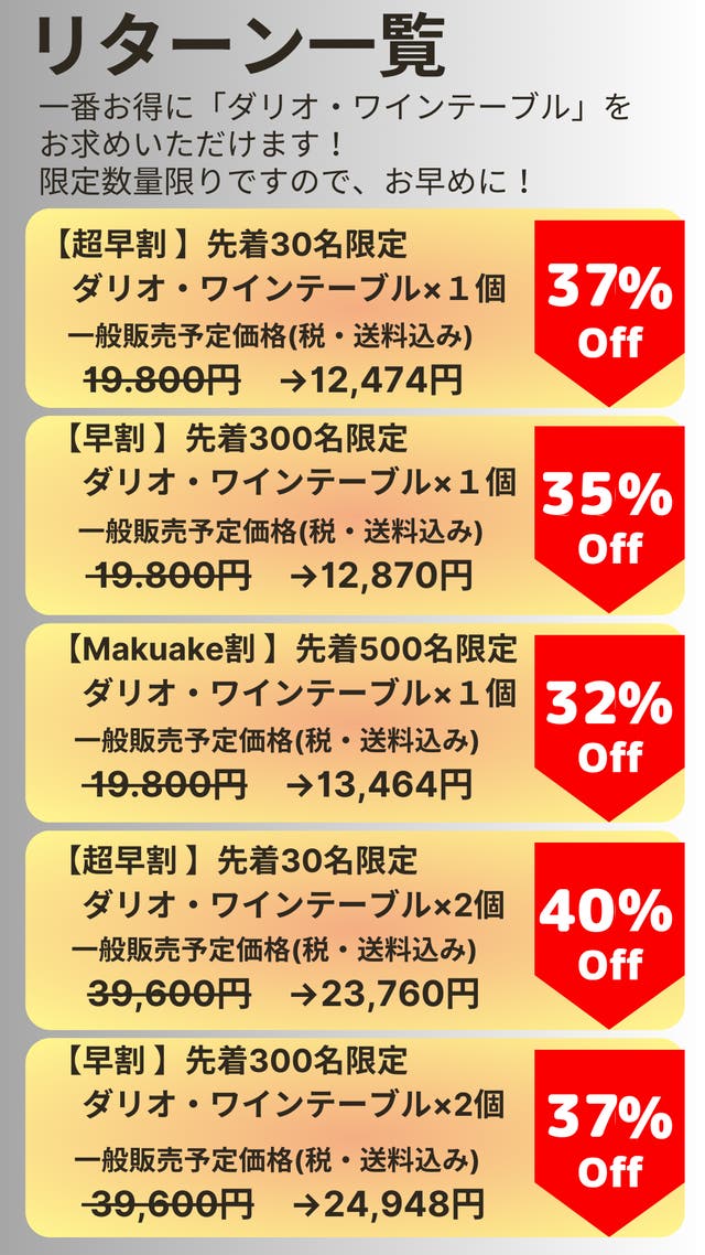 ※皆様から想定を上回る応援購入を頂き、量産体制を更に充実させることができた場合、一般販売価格が予定価格を下回る可能性がございます。