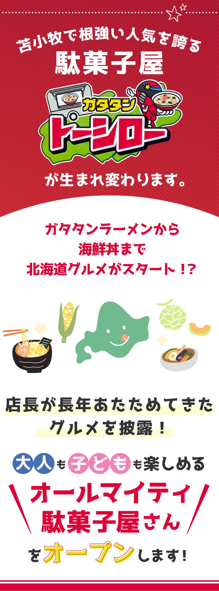- 地域で人気の「駄菓子屋トーシロー」をリニューアル!芦別名物のガタタンラーメンや焼き鳥をご提供。