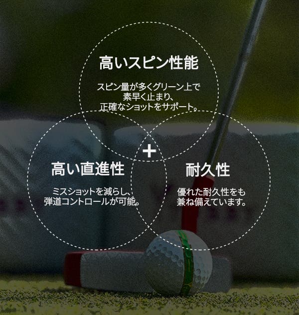 柔らかい打球感、高いスピン量、優れた精度、高い耐久性の4つを全て兼ね備えたゴルフボールです。コアの圧縮率が低く、柔らかい打球感が特徴です。