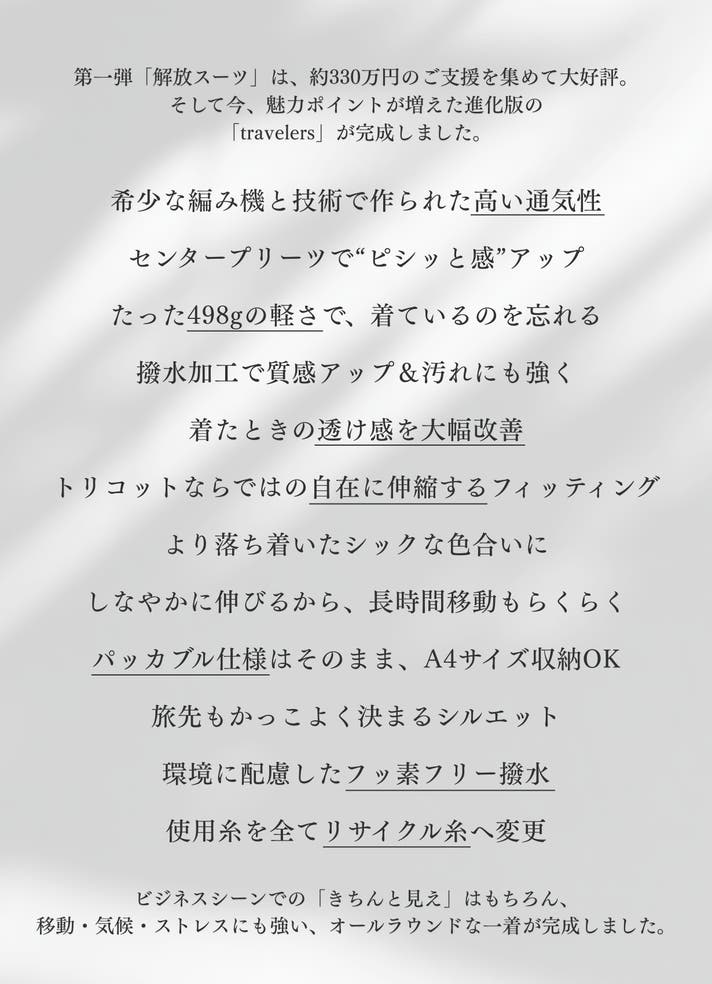 前回、大好評の解放スーツがtravelersモデルとして新登場。