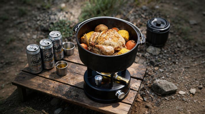 重いダッチオーブンや大型クッカーでもぐらつくことなく安定して支えます。