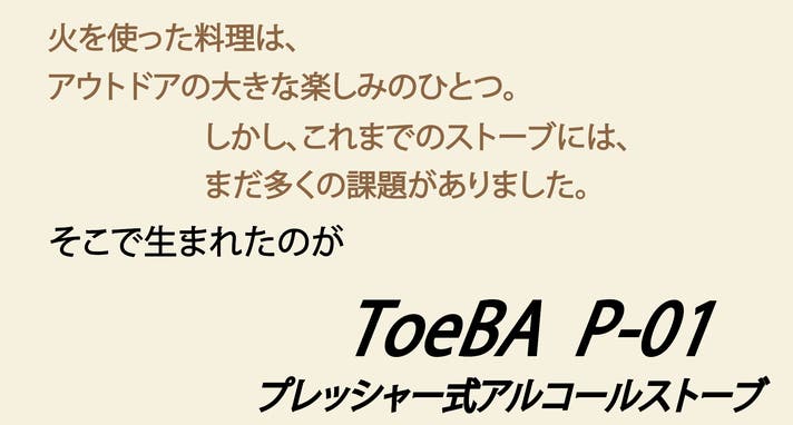 「Makuake(マクアケ)」は、実行者の想いを応援購入によって実現するアタラシイものやサービスのプラットフォームです。このページは、 プロダクトカテゴリの 「キャンプでも家でも、本気の火力。内臓ポンプ搭載のアルコールストーブ ToeBA」プロジェクト詳細ページです。