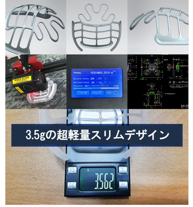 スプリングマスクガードをサポーターしてくださったサポーター様のご意見でお悩みしました。 さまざまな挿入方法で製作してみました。 開発初期には挿入部分を小さく設計しましたが、ガードを挿入後に固定にならなくて動いていてより不便でした。 そして、さまざまな顔形態と高低があるという意見に、顔の形に合わせて3ヵ所挿入できるように製作しました。