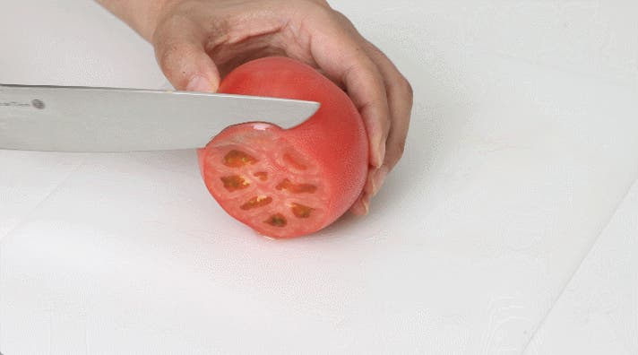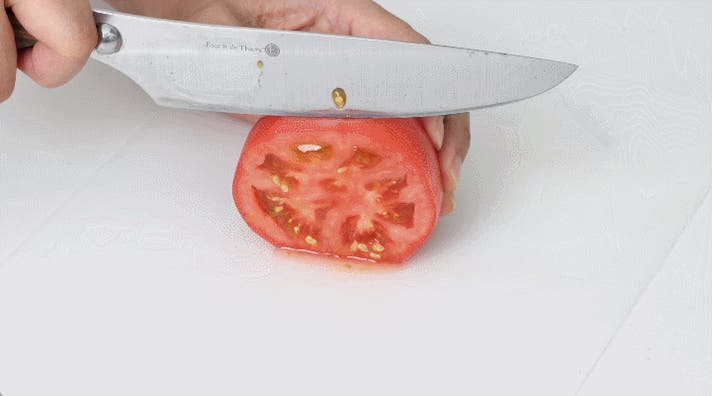 鈍った包丁では厚くしかトマトをスライスできませんが、【TOGIMEISTER 刃之匠】で研ぎ直した包丁は向こうが透けて見えるほど薄くスライスできます。