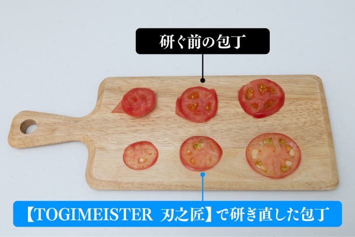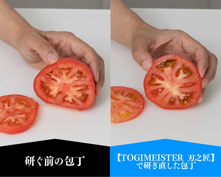 研ぐ前の包丁は刃を充てただけでトマトが潰れ、刃が入りにくいのに対し、【TOGIMEISTER 刃之匠】で研ぎ直した包丁は刃がスーッと入ります。