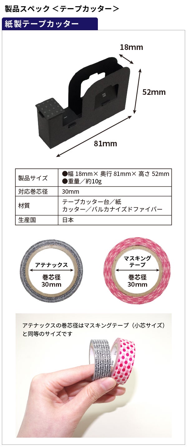 紙製テープカッターは小芯サイズ(幅15mm 芯径30mm)のマスキングテープにも対応しています。