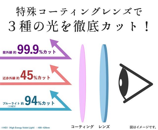 日光やディスプレイに多く含まれるブルーライト(※HEV)を94%カット!