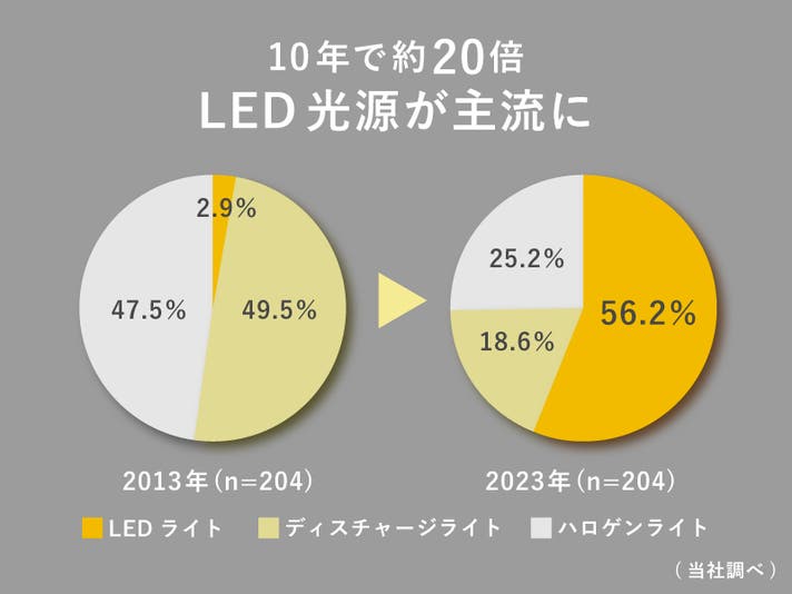 私たちの調査で、車のヘッドライトは驚くべき速度でLED光源に置き換わっていることが分かりました。