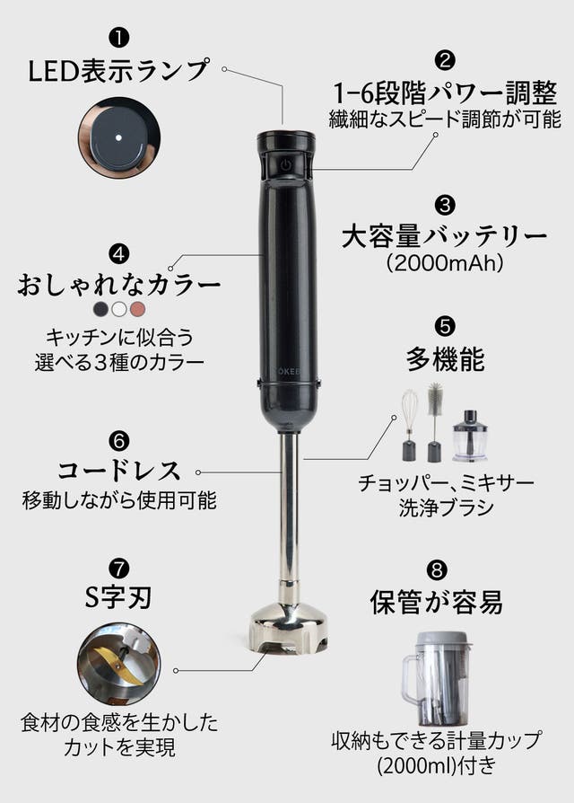 - 超パワフル!最大毎分約15,000回の回転で、食材を素早く撹拌する!