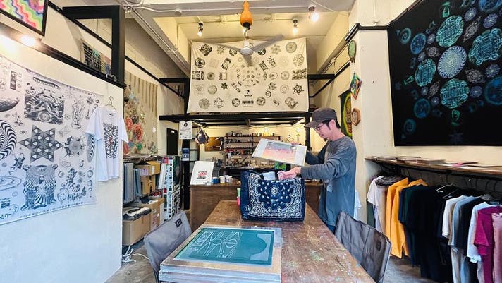 銀天版店は沖縄県コザ(沖縄市)にある、開業して5年ほどの小さなシルクスクリーン印刷店です。当店のデザインを持ち込んでもらった衣類等にその場でプリントできるほか、店舗のユニフォームやクラスTシャツなど、お客様のオリジナルデザインの製版、プリントも小ロットから承っています。