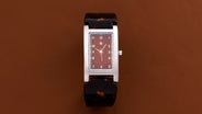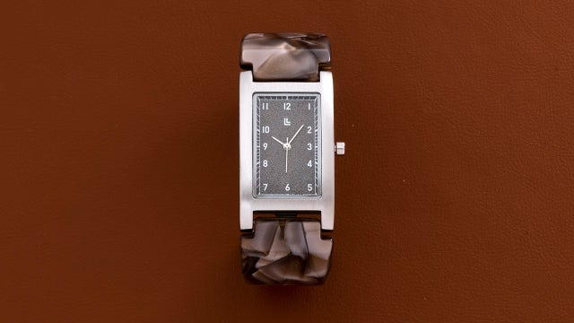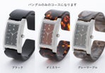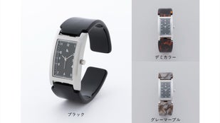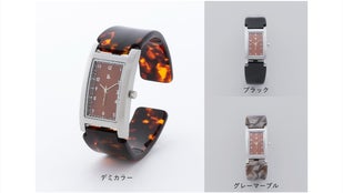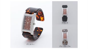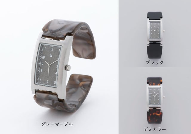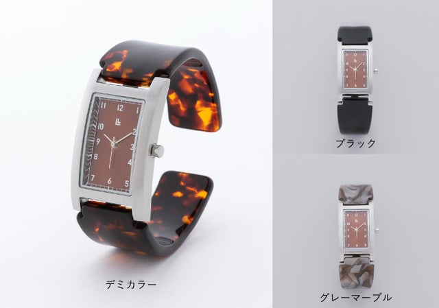 縦に長いスクエアの文字盤は横径をバングルと同じサイズに揃えることで、スーツやビジネスシーンに映える洗練されたクールな印象に。美しいカーブをつくるバングルは肌にやさしい自然素材のアセテートを使い、手首を曲げても邪魔にならず、しっかりしたホールド感でクルクル回ることはありません。文字盤とバングルは、それぞれスーツに似あう黒・茶・灰系の落ち着いた3色を展開し、自由に付け替えが可能。シックなトーンに統一しているので、どの組み合わせもお洒落に仕上がります。