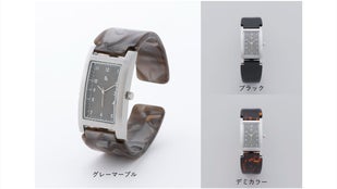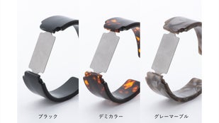 バングルには、眼鏡フレームに使われる植物由来の自然素材アセテートを使っています。カラーは、文字盤にリンクした黒系の「ブラック」、べっこうをモチーフにした茶系の「デミカラー」、灰系の「グレーマーブル」の3色。古くから伝わる研磨の道具と職人技で、やわらかなフォルムとフィット感を実現しています。また、インデックスやロゴには、眼鏡づくりで用いられる精緻なパット印刷を採用しました。