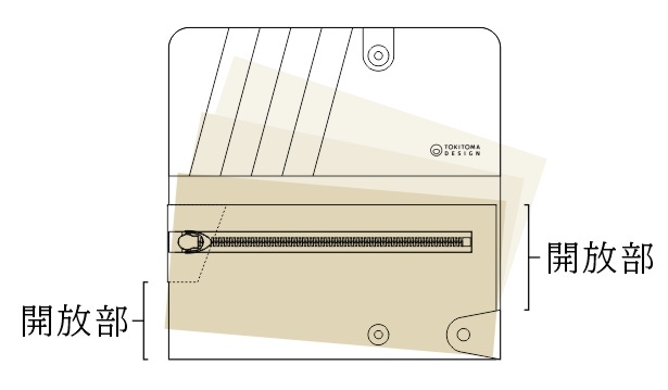 横側をすべて閉じるのではなく、開放部を設け、ななめにお札をいれることで、ギリギリの幅でも余裕をもって収納できるようにしています。左側はマチの構造になっており、お札を取り出す際に開いて見やすくなります。