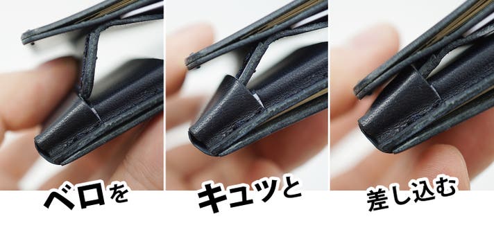 そこで思い切ってベロの幅を少し狭めてみたところ、財布全体の構造がしっかりしているため固定力は全く問題ありませんでした。むしろ、受け側との間に生まれた適度な余裕が、よりスムーズな抜き差しを実現してくれたのです。
