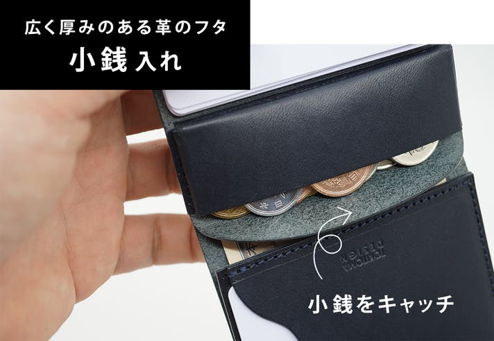 写真の、逆さにしても曲がったクセのついた広々とした革のフタが、小銭を簡単に落とさない構造になっています。