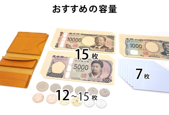 収納可能容量: カード…7 枚、紙幣…15枚、小銭…15枚