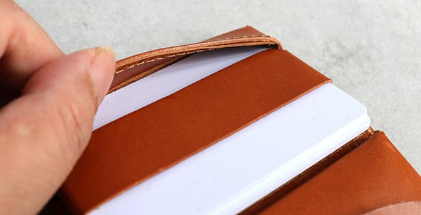 革がほどよい柔らかさなので、このようにくっと曲げてすっと簡単に出し入れすることができます。