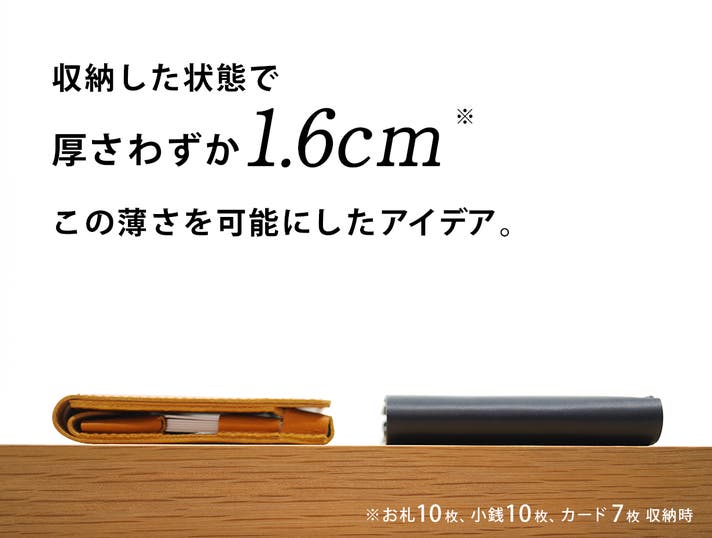 - カードを財布の"骨格"として設計し、収納しても厚さ1.6cm 極薄レベルを実現。