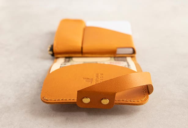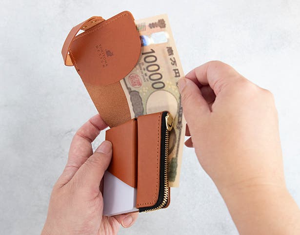 - 財布を開く手間をなくし閉じたままスマートに小銭へアクセス 。ホックを使わず帯でとめる構造