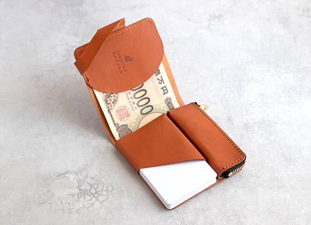 同時に、小銭入れのために財布全体を開くという「余計な動作」もなくしたかった。そこで、財布を閉じたままアクセスできるL字ファスナー小銭入れ と、お札が見やすく取り出しやすい札入れレイアウトを考案しました。