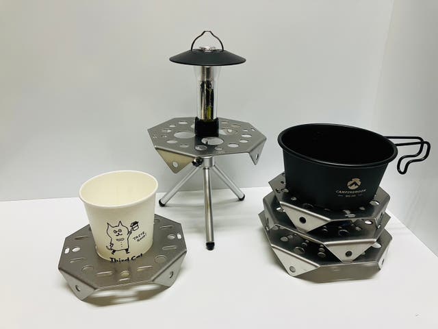 そのホルダーをMakuake用に改良しようと考えた時に、キャンパーの人に便利に使ってもらいたいと思い、「五徳・焚火台」「オクタゴンテーブル」として使えるように進化させたのが、3wayミニテーブルができた経緯です。