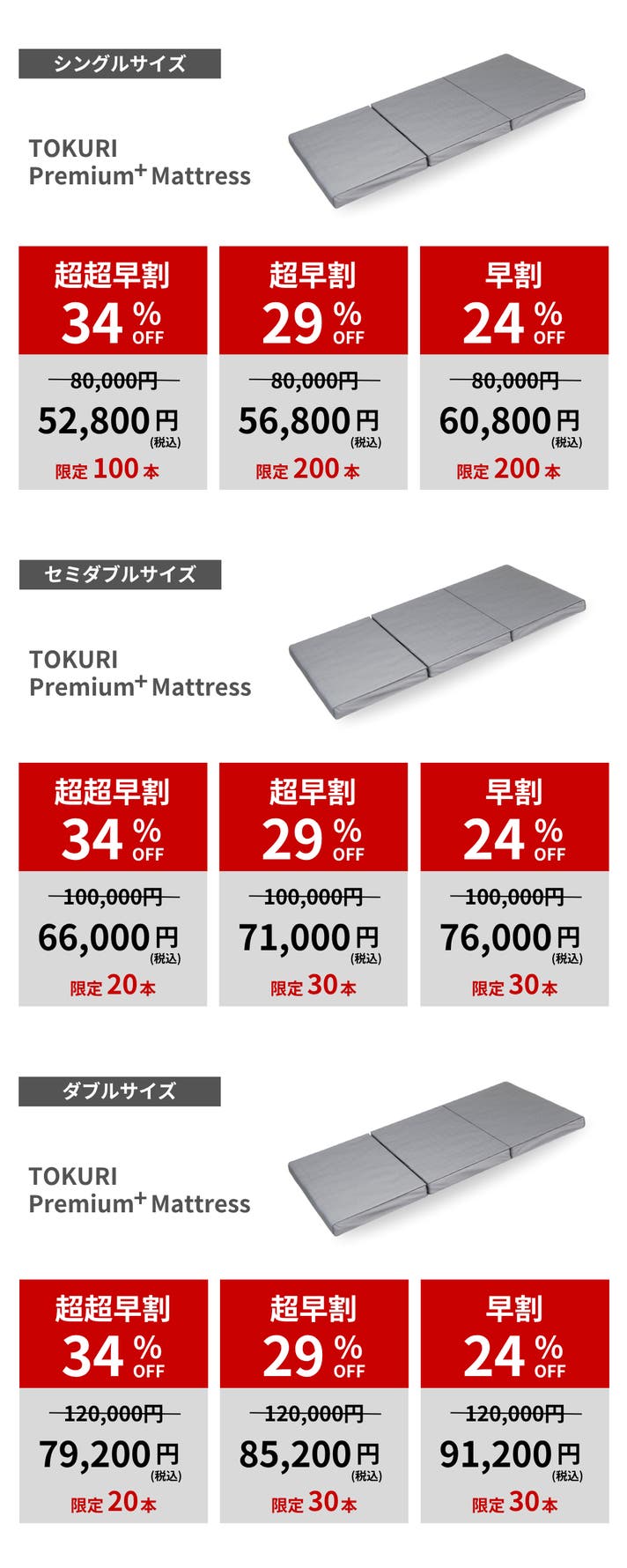 ・TOKURI Premiam+ マットレス(ダブルサイズ)×1本[一般販売予定価格120,000円の34%OFF!]