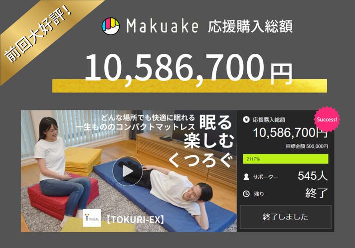 前回1,000万円を超える応援購入を得てリリースされたTOKURI-EXコンパクトマットレスをさらに進化させたマットレスタイプ「TOKURI Premiam+ mattress」