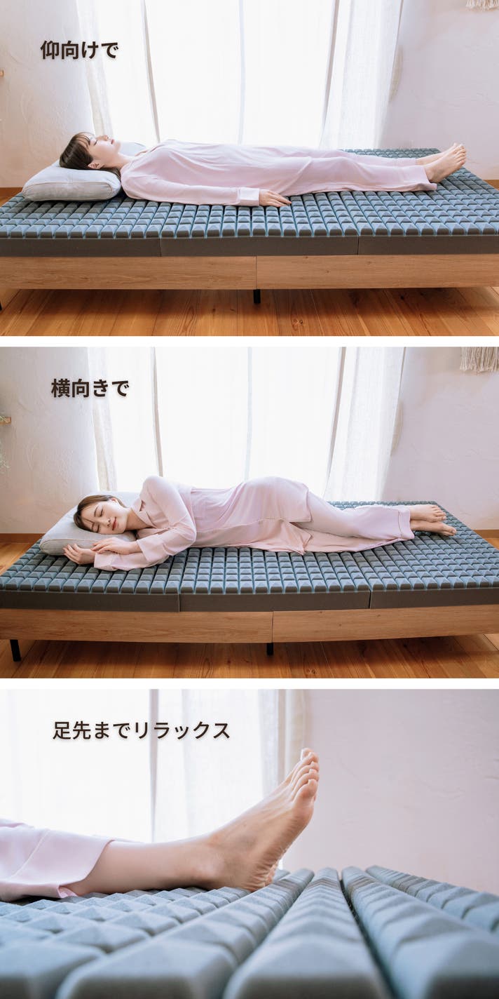 頭から背中、腰、臀部、太もも、ふくらはぎ、足先まで、睡眠時にかかる全身の負担を軽減し、優しくサポートできるマットレスを目指して設計してます。