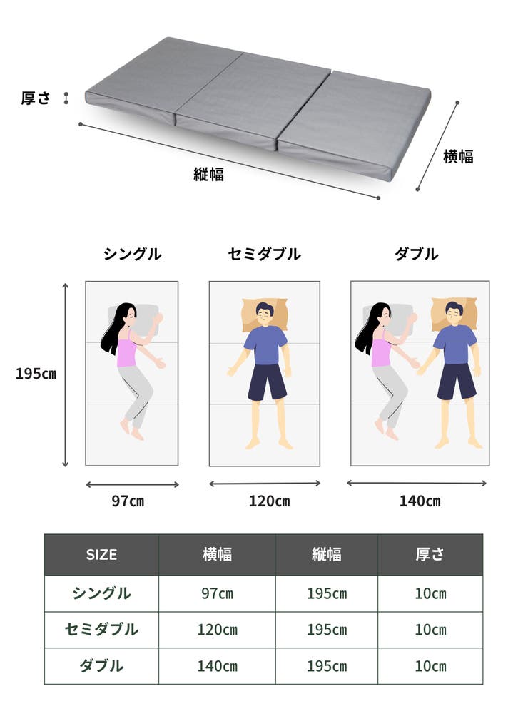 厚さ10cmで全身をしっかりサポート。厚すぎず手軽に移動できる重量はシングルサイズで約5.5kg。