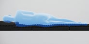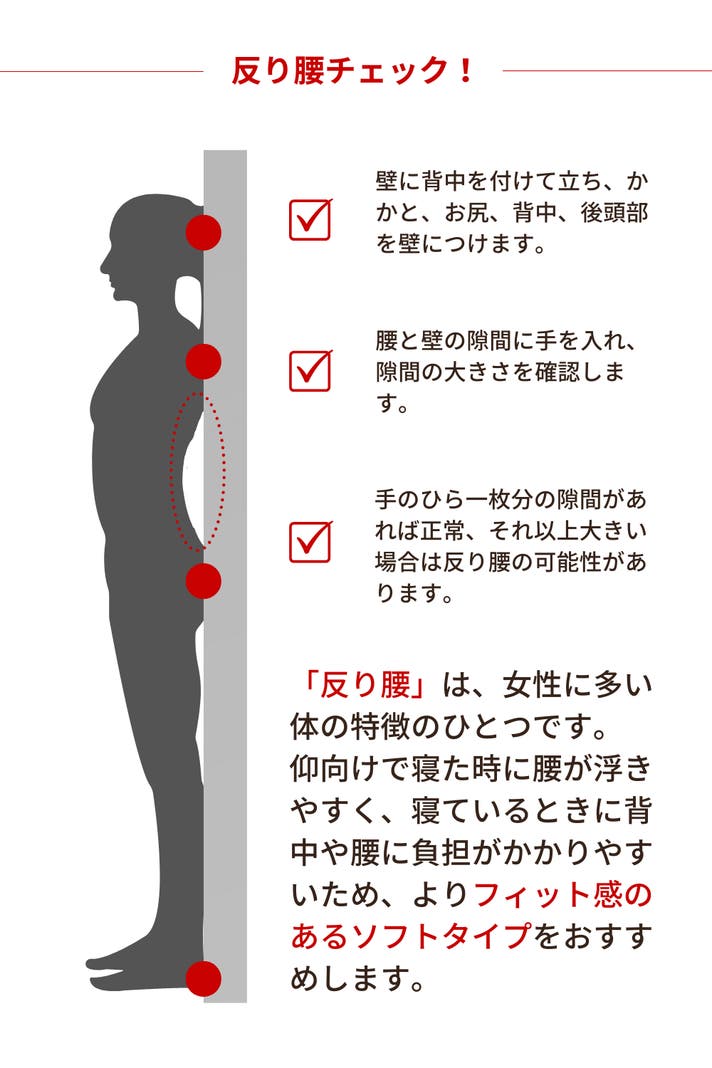 この画像のように体型によってレギュラータイプでは仰向けで寝た時に腰が浮いてしまって負担を感じる場合があります。反り腰のお客様の体にも全身がフィットできるようにソフトタイプをご用意しました。