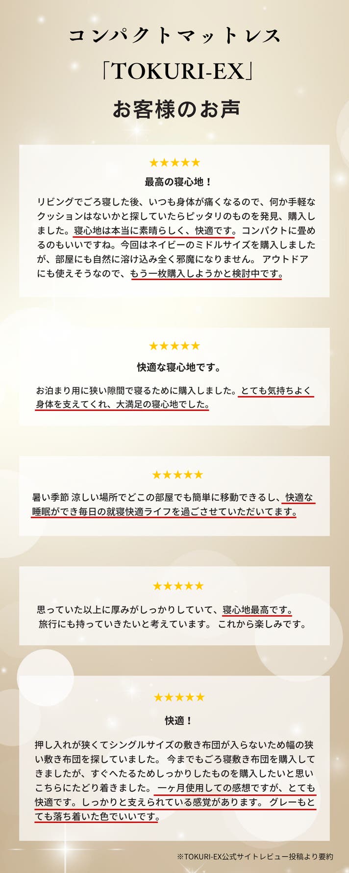 寝心地について迷われてる方は参考になるレビューがたくさん届いておりますので「TOKURI-EX」で検索してご確認頂けますと幸いです。