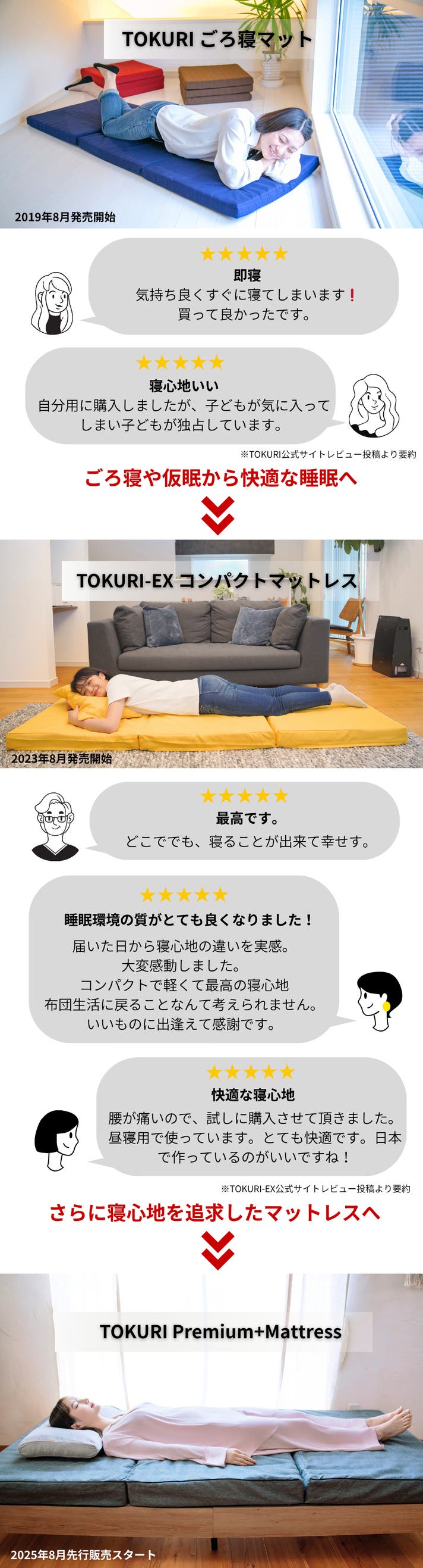 TOKURIシリーズ第3弾。「TOKURIごろ寝マット」「TOKURI-EXコンパクトマットレス」に続いて、ついに「TOKURI Premiam+ mattress」として、マットレスサイズの販売を開始します。