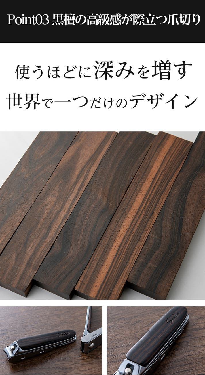黒檀は、その美しい木目と高い耐久性で知られる高級素材です。爪切りの握り部分に黒檀を採用することで、使うたびに手に馴染む心地よさと、持つだけで感じられる特別な風格を兼ね備えています。