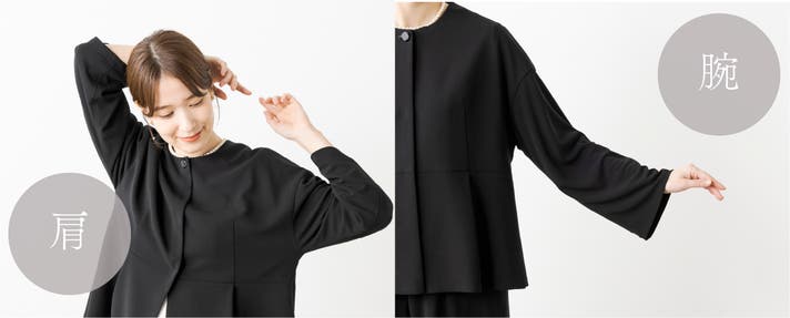 一般的にブラックフォーマルには布帛(織物)素材を使用しますが、【たためて洗えるブラックフォーマル】はニット(編物)素材を使用しているため、織物素材と比較して非常に高い伸長率があります。