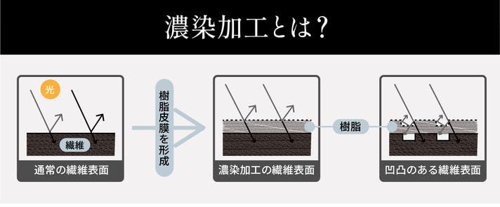 繊維表面がクレーター上になっている樹脂皮膜を形成し、反射率を抑え濃色効果を発揮。加えて繊維上にも凹凸を作り上げ、更に深みのある黒を表現します。