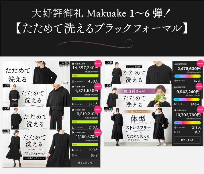 「Makuake(マクアケ)」は、実行者の想いを応援購入によって実現するアタラシイものやサービスのプラットフォームです。このページは、 ファッションカテゴリの 「【冠婚葬祭&日常】TPOでもう悩まない|東京ソワールのスマートブラックフォーマル」プロジェクト詳細ページです。