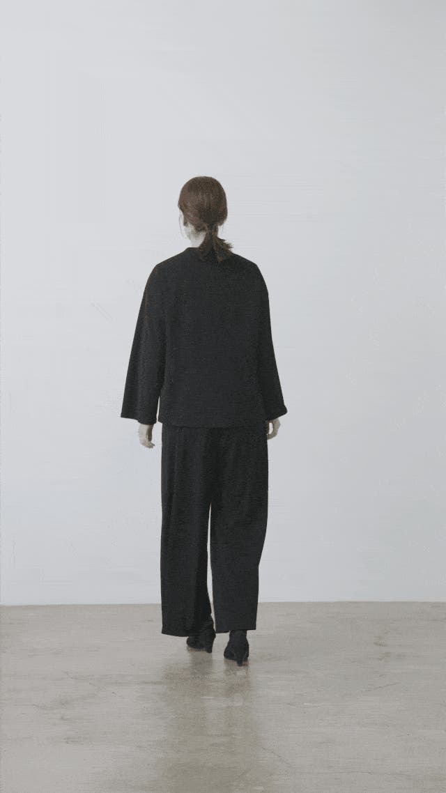 タックの深さを調整し、センターラインをきれいに演出。横に広がりがちなワイドパンツをスッキリと美しく着こなして頂けるよう仕上げております。